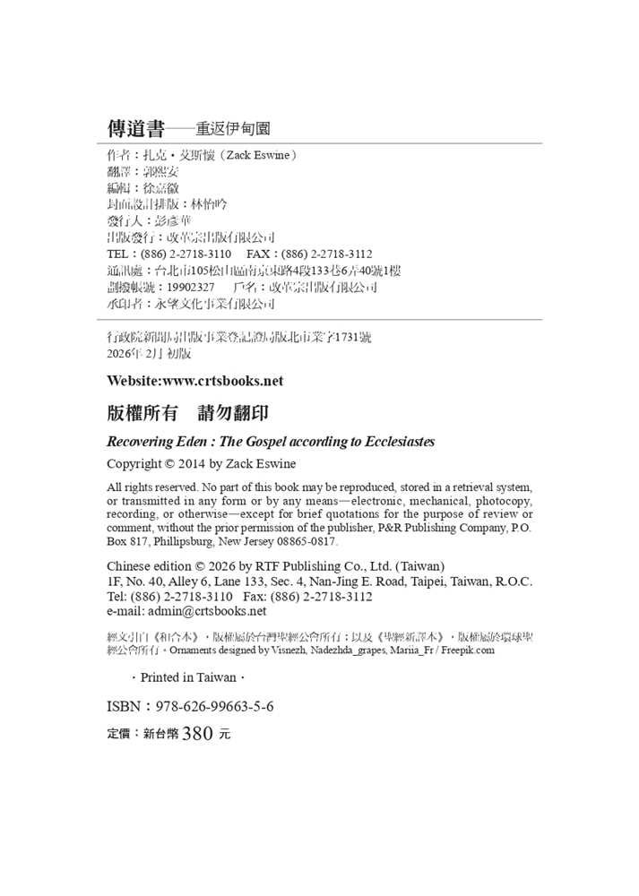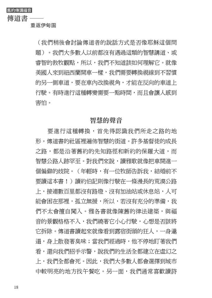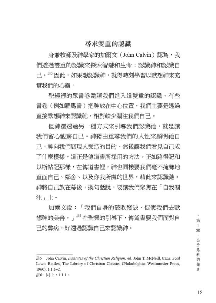 傳道書誠實地揭露「沒有神」的生命樣貌,探究人試圖在神以外尋找自我拯救之道,它揭穿我們的偽裝──除去我們的無花果葉;把我們帶向深淵、陷入絕望;揭露「日光之下」生命的虛空,讓我們呼喊:「誰能拯救我?」