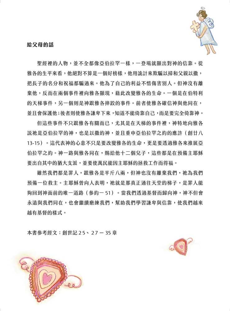 雖然我們都是罪人,跟雅各是半斤八兩,但神也沒有離棄我們,祂為我們預備一位救主。主耶穌曾向人表明,祂就是那真正通往天堂的梯子,是罪人能夠回到神面前的唯一道路(參約一51)。當我們透過基督歸向神,神不但會永遠與我們同在,也會繼續磨練我們,幫助我們學習謙卑與信靠,使我們越來越有基督的樣式。